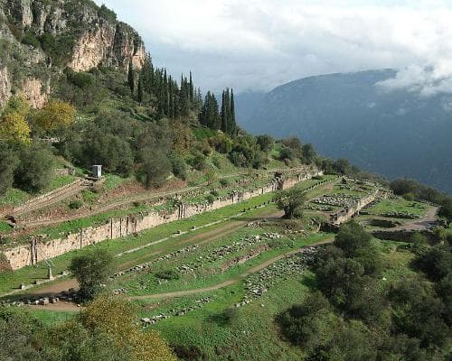 德尔斐,古镇,也是希腊最重要的神庙和阿波罗神谕的所在地。它位于帕纳苏斯山陡峭的下坡上的福西斯境内,距离科林斯湾约6英里(10公里)。德尔福现在是一个主要的考古遗址,拥有保存完好的废墟。它于1987年被指定为联合国教科文组织世界遗产。德尔斐被古希腊人认为是世界的中心。